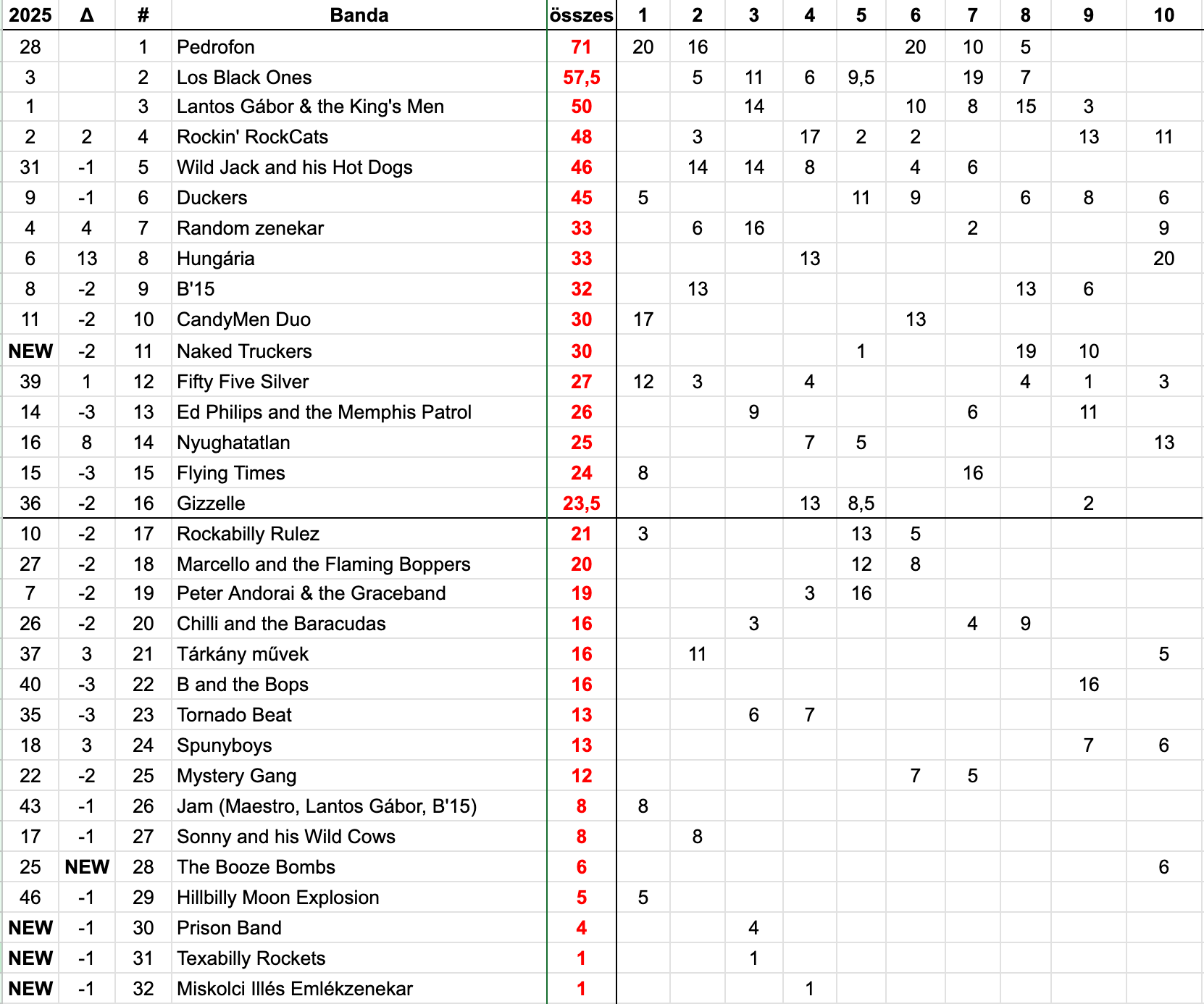 A listát jelenleg a Miskolci Illés Emlékzenekar zárja a 32. helyen.